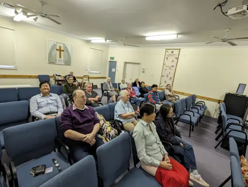 The service starts promptly at 9:00 am and runs for just over an hour. Prayers, a message and hymns are (enjoyed) by the gathered members. After the service we move to the front hall for a morning tea. ZZZZZZZZ